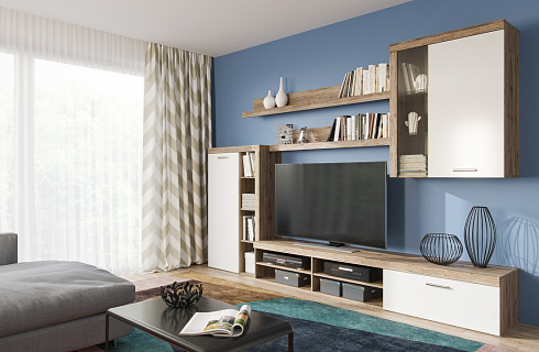 Стильно, лаконично, функционально. Отсутствие громоздких шкафов в наборе мебели Can Be отлично компенсируется невысоким стеллажом с открытыми и закрытыми полками, большой TV-тумбой и навесным шкафчиком со стеклянной дверцей.Стенка продается только в комплекте. Габаритный размеры: Ш-3000 В-1975 Г-405 мм. Габаритные размеры по высоте и ширине - рекомендуемые.