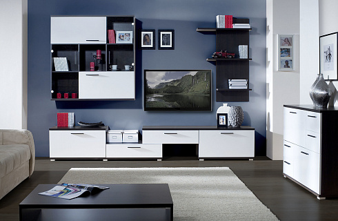 Функциональность набора Domingo подчеркивается множеством полок и ниш для размещения вещей. Оригинальным акцентом является тумба под ТВ, которая состоит из 2 модулей, и сочетание глянцевых и стеклянных фасадов в настенном шкафу. Такой современный дизайн подарит интерьеру новое дыхание.