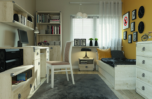 Что главное в детской? Удобная кровать? Большой шкаф? Или функциональный письменный стол? Безусловно, все это важно, но главное - это простор для воображения! Благодаря коллекции Индиана ребенок окунется в мир Дикого Запада, побывает в трюме пиратского корабля и даже сможет спрятать все свои сокровища в настоящий сундук! Здорово, не правда ли?Коллекция Индиана не похожа ни на классическую, ни на современную мебельную моду. Имитация состаренного дерева, металлические накладки на углах, ярко выраженная древесная структура - далеко не все отличительные особенности коллекции. Благодаря широкому ряду элементов системы вы без труда обустроите молодежную.