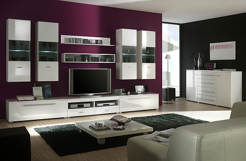 Стильный набор мебели в стиле хай-тек. Глянцевые фасады, правильные формы элементов, светодиодная подсветка - акценты, позволяющие создать гостиную для приверженцев активной урбанистической жизни.Современный характер коллекции предает фурнитура простой формы в цвете «алюминий». Удлиненные продольные ручки в комодах подчеркивают геометрические формы мебели, а подсветка стеклянных полок помогает создать неповторимый уют в интерьере.
